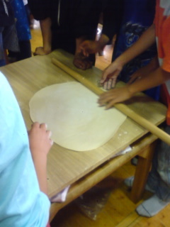 ほうとう作り体験。練った粉を次は伸ばす作業です。(11時35分)