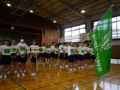 選手は当日の開会式と同じ格好で入場しました。選手は全員背中に「11中」のナンバーカードを背負って行進します。応援は応援リーダーが中心になって、これまでの練習の成果を披露しました。