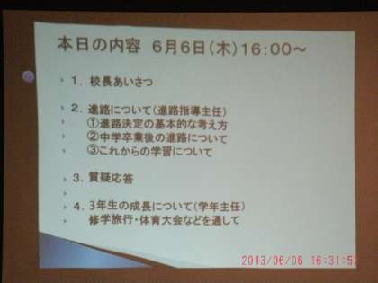 三年生の保護者の皆様だけではなく、一、二年生の保護者の皆様も大勢参加されています。今後進路についての保護者会は何回か行います。ぜひご参加ください。