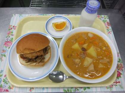 今日は1年生が理科講演会でパーシモンホールに出かけるため、配膳しやすいメニューです。「ポークビーンズ」は、白いんげん豆と豚肉をトマト味で煮込んだアメリカの家庭料理です。十一中のポークビーンズには、白いんげんとうずら豆の2種類の豆を使っています。お豆は柔らかく煮るために水に一晩つけておきます。