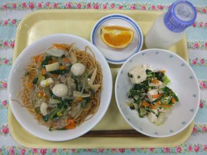 今日の主食は「五目あんかけそば」です。「五目」とは、数種類の材料を彩りよく、また栄養的にもバランスよく取り合わせて作った料理に付ける名前です。(中国語では「什錦(シーチン)」と言います。)今日はたけのこ、にんじん、チンゲン菜などの野菜や、豚肉、いか、うずら卵など色々な材料を使っています。