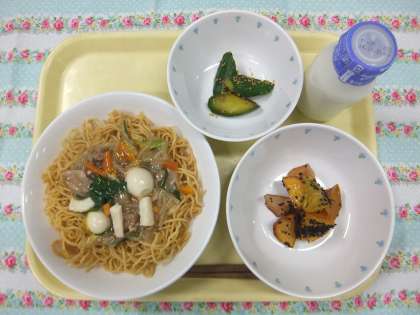 昨日は台風の事前対応のため、給食が無しになり申し訳ありませんでした。今月出せなかったスパゲティボンゴレ、ハヤシライスは、また来月出すつもりですので、楽しみにしていてください。今日の主食は「五目あんかけそば」です。「五目」とは、色んな材料を彩りよく、また栄養バランスよく取り合わせて作った料理につける名前です。今日も野菜や魚介、うずら卵など様々な材料を使いました。