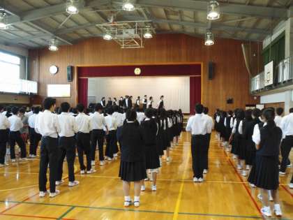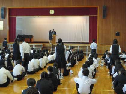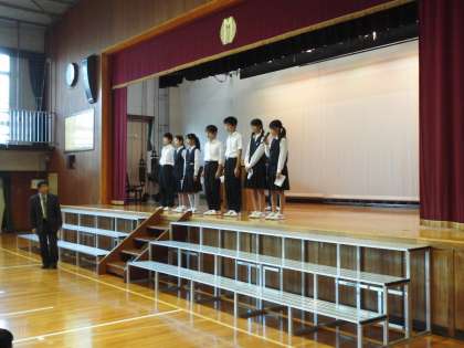 今週が始まりました。朝から良い天気です。本日は生徒会朝礼が行われ、後期の生徒会本部役員を始め、新しくなった生徒会専門委員会の認証式がありました。また、昨日行われた「おまつり広場・みやまえ」においては3つの学年併せて17名のボランティア生徒が割り箸鉄砲を使ったリサイクルのお店を運営し、140名あまりのお客様がお見えになったとのことです。お疲れ様でした。次回のボランティア活動はは26日日曜日「中根住区ファミリーフェスティバル」です。