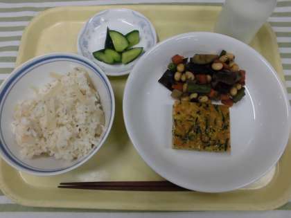 【献 立】 大根めし 牛乳 ふくさ卵 五目煮豆 一塩きゅうり