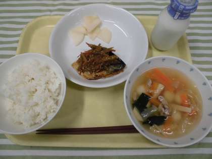 【献 立】 ごはん 牛乳 白玉団子汁 魚のごぼう味噌焼き かぶのゆず風味