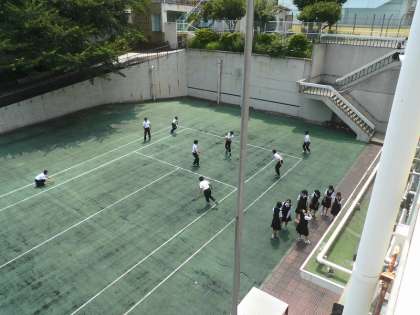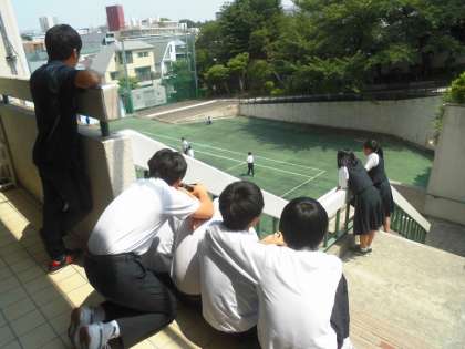 少しまだ湿度の高さを感じますが、夏のようなそんな日です。定期考査を終えた3年生が第1グラウンドでボール遊びに興じ、それを階段で同じ3年生のなかまがひなたぼっこをしながら見ている、そんな光景の2枚の写真です。長閑な光景です。
