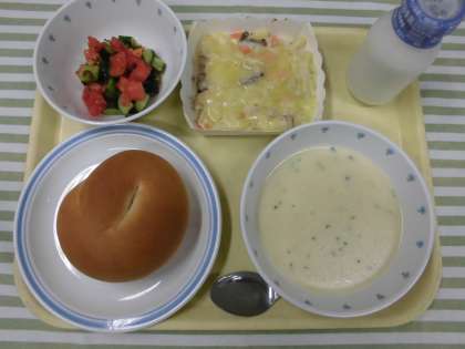 【献   立】 ミルクパン 牛乳 マカロニサラダ じゃがいものポタージュ きゅうりとトマトのサラダ