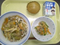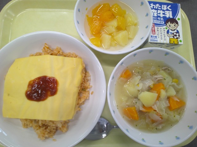 今日は生徒のリクエストから生まれたなんちゃってオムライスです。献立名のなんちゃってオモロライスは給食委員の生徒考案です。オムライスの卵を調理する様子は10月の給食だよりに載せています。また、サイダーを使ったフルーツパンチも人気ですが、炭酸が苦手な生徒もいるということで今日はフルーツポンチになりました。
