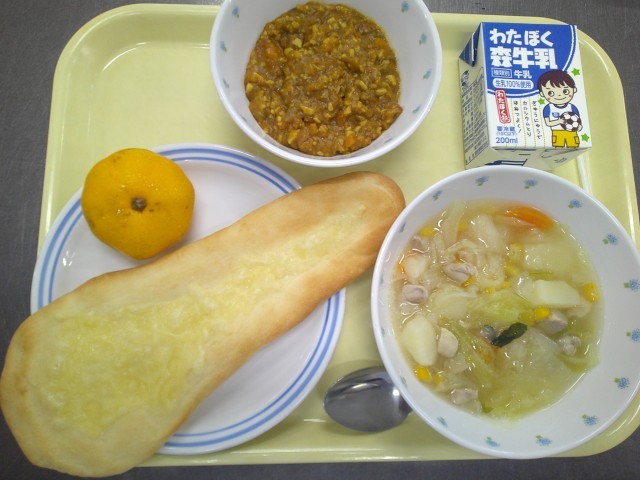 <献立> チーズナン&キーマカレー  野菜スープ  みかん