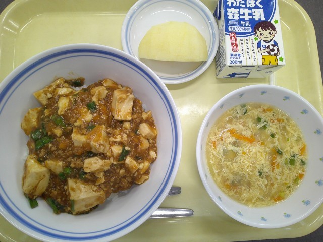 <献立> 麻婆豆腐丼  卵スープ  りんご