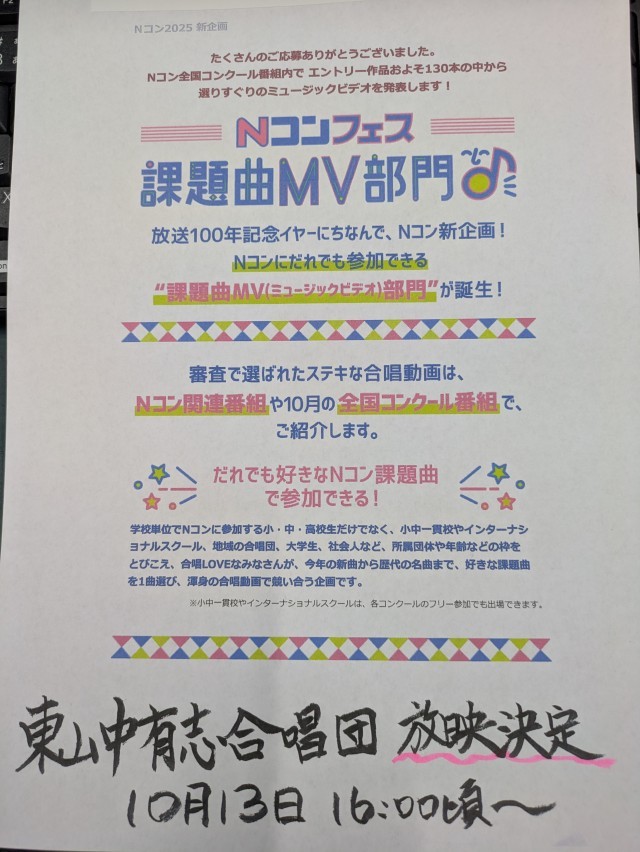10月13日(祝)Nコン MV部門 公開日 2025/10/14 更新日 2025/10/14 学校日記 本校有志合唱団の有志グループが、NHK合唱コンクールのMV部門に応募しました。130本の応募ビデオの中から見事選抜され、13日中学校部門の本選の中で放映されました。すばらしい作品でした。NHK+で見られます!! いいね(3)