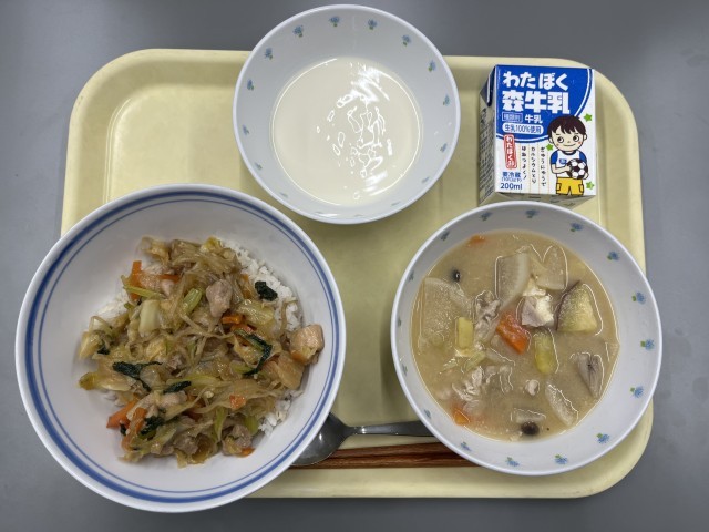 今日は岐阜県の郷土料理です。「鶏チャン」は鶏肉と野菜に特製のタレを絡めて炒めた料理です。「すったて汁」は茹でた大豆をすりつぶした「すったて」に、味噌や醤油などを加えた汁物で、合掌造りで有名な世界遺産・白川村で親しまれている郷土料理です。給食をきっかけに、日本各地の郷土料理について調べてみるのも面白いですね。