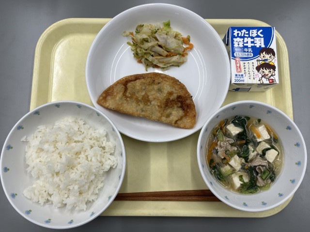 〈献立〉 ご飯 ジャンボ揚げぎょうざ キャベツと胡瓜の中華和え 春雨スープ
