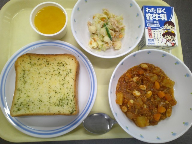 <献立> ガーリックトースト  チリコンカン  レンズ豆入りマカロニサラダ  オレンジゼリー
