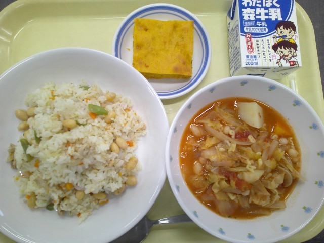 <献立> 大豆ピラフ ABCスープ パンプキンケーキ