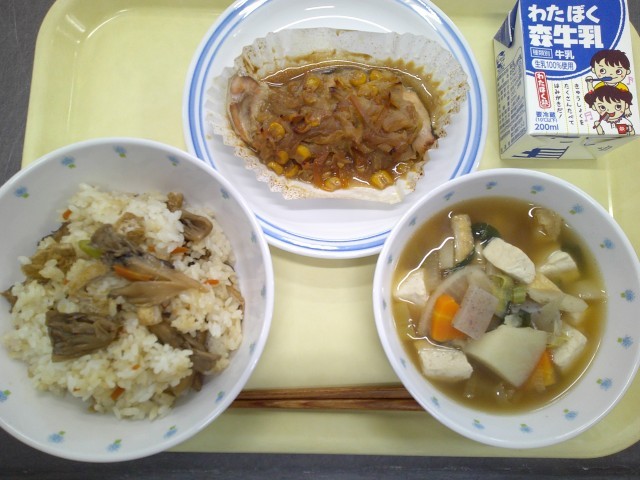 <献立> きのこおこわ  鮭のチャンチャン焼き  けんちん汁