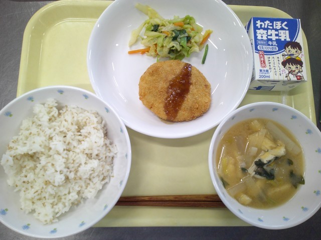 <献立> ごまご飯 ポテトコロッケ 野菜の辛子醤油和え 味噌汁