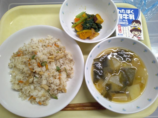 <献立> まつぶた寿司 秋野菜の香り揚げ 味噌汁