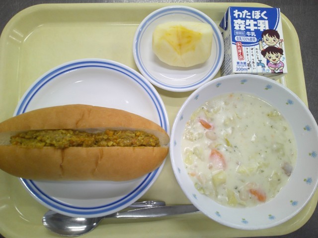 <献立> ホットカレーミートサンド  ベーコンと豆のクリームシチュー  りんご