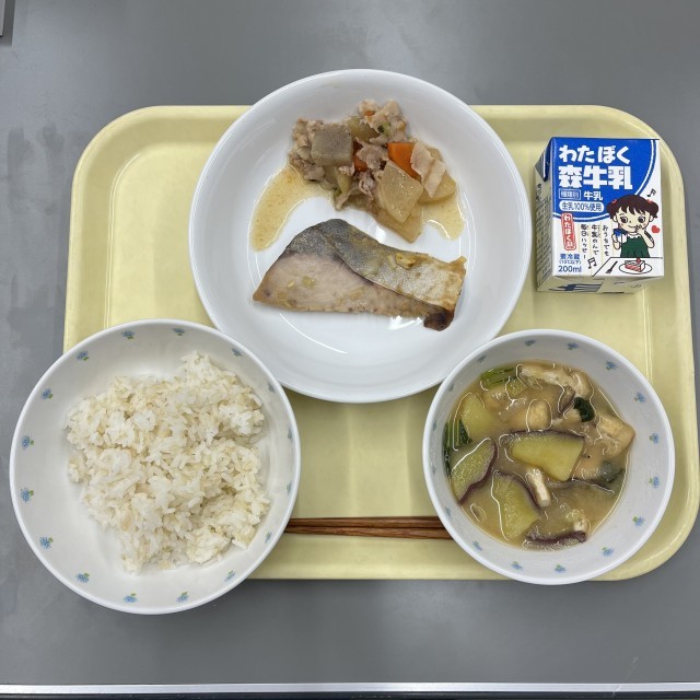 12月12日献立 公開日 2025/12/15 更新日 2025/12/15 給食 〈献立〉ご飯 ぶりのネギみそ焼き 豚バラ大根 さつま芋の味噌汁〈産地〉長ねぎ(新潟県)、しょうが(高知県)、人参(千葉県)、さつまいも(千葉県)、しめじ(長野県)、小松菜(東京都)、本ブリ(岩手県)、黒板こんにゃく(群馬県)、油揚げ(愛知県・佐賀県)、豚肉(鹿児島県) いいね(0)