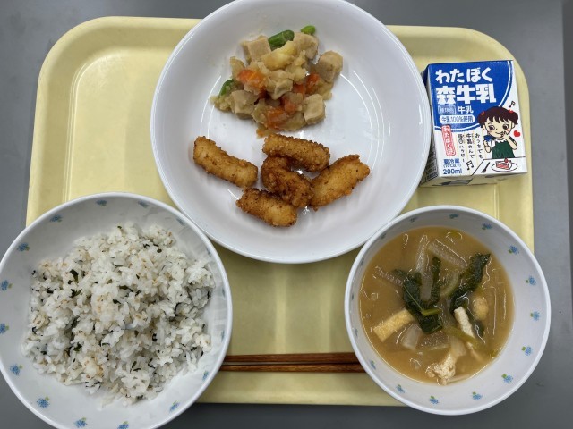 今日の給食は、いかのかりん揚げがあります。いかの食べ応えのある食感と、サクサクの衣がとてもおいしいですね。