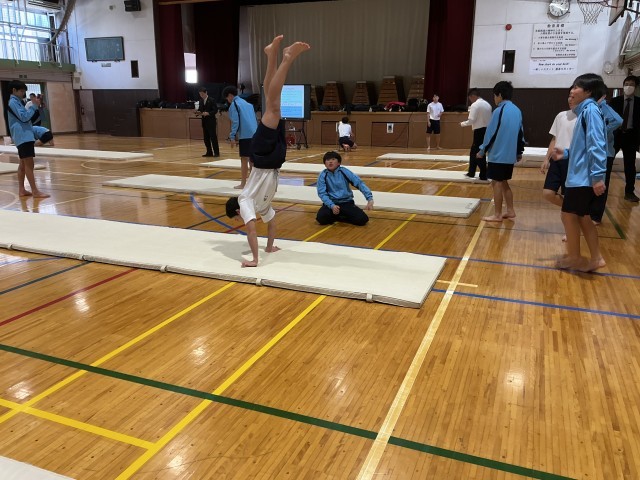 1年男子はマット運動に取り組んでいます。動画を撮り合ったり他者の動きを参考にしたりして、自分の動きの改善点について考えていきます。