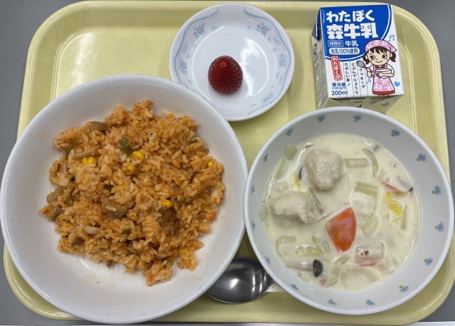 2月2日献立 公開日 2026/02/03 更新日 2026/02/03 給食 〈献立〉チキンライス 白菜と鶏団子のクリームスープ 果物(いちご)〈産地〉にんにく(青森県)、玉ねぎ(北海道)、にんじん(千葉県)、しめじ(北海道)、ピーマン(宮城県)、白菜(茨城県)、ホールコーン(北海道)、苺(栃木県)、鶏もも肉(静岡県)、鶏がら(静岡県)、ベーコン(九州)、鶏むねひき肉(静岡県) いいね(0)