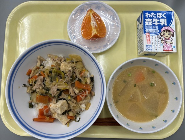 〈献立〉すき焼き丼 生姜汁入り味噌汁 果物(はるみ)