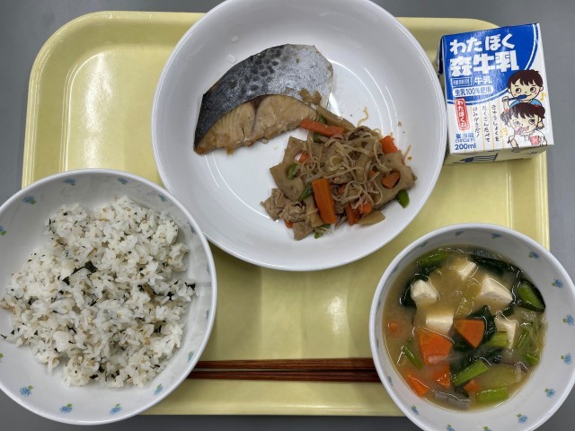 〈献立〉わかめご飯 さわらの山椒焼き 蓮根の金平 さつま汁