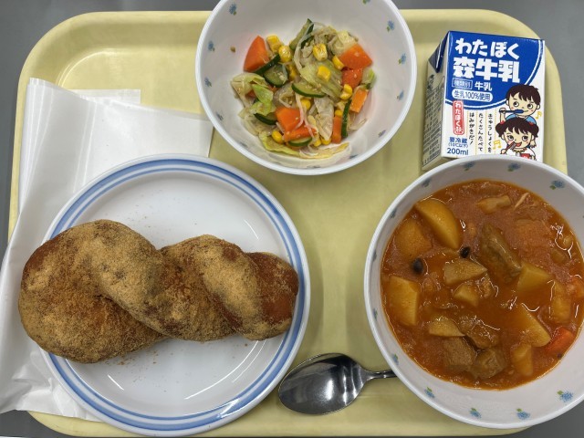 〈献立〉きな粉揚げパン ポークシチュー 味噌ドレッシングサラダ