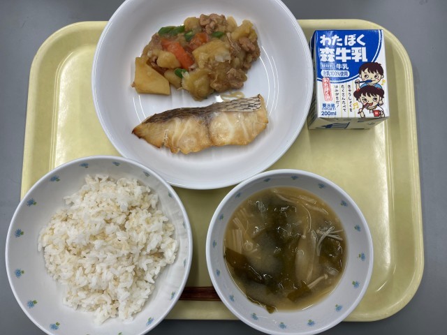 3月6日献立 公開日 2026/03/06 更新日 2026/03/06 給食 〈献立〉ご飯 真鯛のバター醤油焼き 肉じゃが 味噌汁〈産地〉じゃがいも(北海道)、にんじん(千葉県)、玉葱(北海道)、さやいんげん(沖縄県)、だいこん(神奈川県)、えのきたけ(新潟県)、長ねぎ(千葉県)、わかめ(韓国)、真鯛(宮城県)、白滝(群馬県)、豚肩肉(鹿児島県) いいね(2)