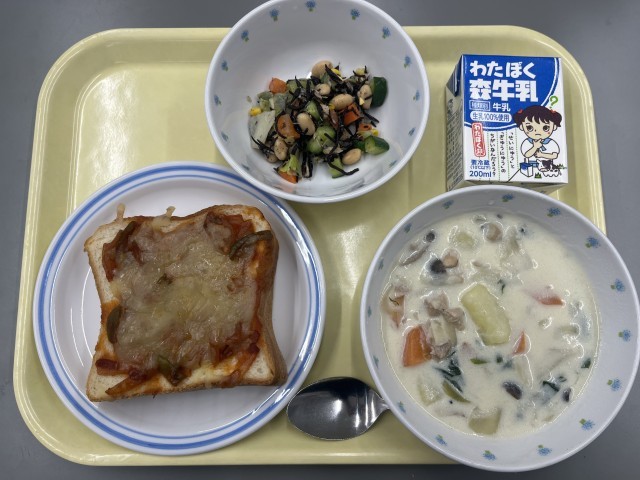 〈献立〉ピザトースト 野菜のクリームシチュー 大豆のサラダ