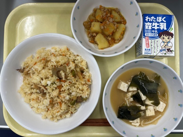 〈献立〉五目寿司 じゃがのそぼろ煮 豆腐とわかめの味噌汁