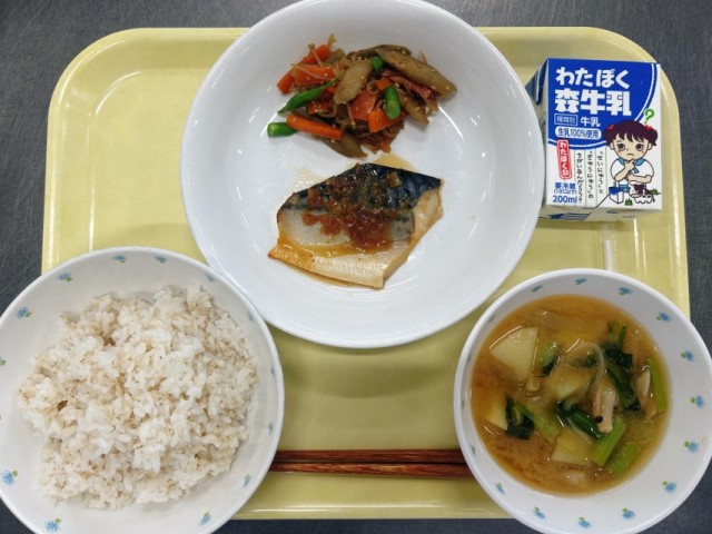 4月14日献立 公開日 2026/04/14 更新日 2026/04/14 給食 〈献立〉ご飯 鯖の韓国風焼き 五目金平 じゃがいもの味噌汁〈産地〉にんにく(青森県)、しょうが(高知県)、長ねぎ(千葉県)、ごぼう(青森県)、人参(徳島県)、いんげん(沖縄県)、じゃがいも(鹿児島県)、しめじ(長野県)、小松菜(東京都)、さば(欧州)、白滝(群馬県) いいね(1)