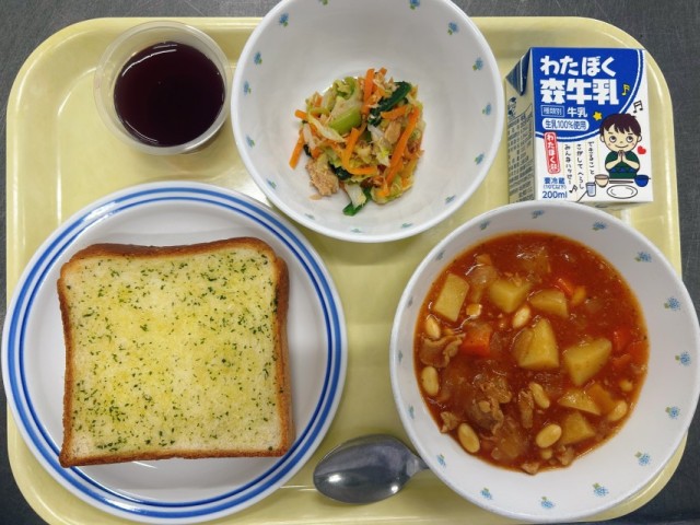 今日の献立のガーリックトーストは、にんにくがよく効いていて美味しく食べられます。ぶどう寒天ゼリーもさっぱりとした甘さが特徴です。