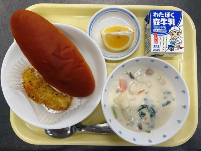 4月27日献立 公開日 2026/04/28 更新日 2026/04/28 給食 〈献立〉黒砂糖パン 魚の香草焼き 野菜のチャウダー 果物(柑橘)今回の献立の黒砂糖パンは、黒砂糖の優しい甘みが特徴です。 いいね(0)