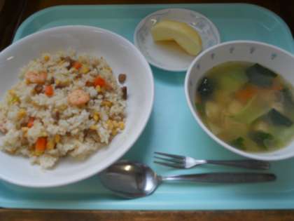 12月3日木曜日 公開日 2015/12/03 更新日 2015/12/03 給食 五目チャーハン 中華スープ りんご 牛乳 産地情報 ムキエビ(タイ)卵(秋田)豚肉(熊本)人参(千葉)長ネギ(千葉)しょうが(高知)チンゲン菜(静岡)りんご(山形) いいね(0)