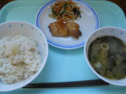 12月22日火曜日 公開日 2015/12/22 更新日 2015/12/22 給食 大根飯 鶏の照り焼き ごま和え 味噌汁 牛乳 産地情報 鶏肉(鳥取)大根(神奈川)しょうが(高知)ほうれん草(埼玉)もやし(山梨)にんじん(千葉)じゃがいも(北海道)長ネギ(千葉)わかめ(徳島) いいね(0)