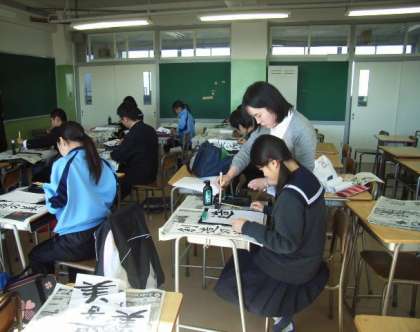 本日、日本文化への興味・関心を高めるために、3階の進路指導室で帰国生徒冬期補充教室を実施しました。参加した生徒は、いっしょに参加してくれたALTとの会話を楽しみながら、百人一首や書き初めに取り組んでいました。