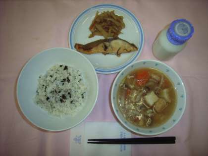 料理名にはそれぞれの由来(ゆらい)があります。今日は白の甘味噌(西京味噌)で漬けこんだ西京漬けの焼き魚、おろし大根をみぞれに見立てた汁ものです。