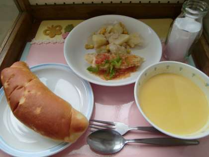 にんじんは目の疲れや肌荒れ防止に役立ちます。今日のポタージュは、にんじんの甘味を感じられるスープに仕上げました。一口も食べずに残したりしないでくださいね。