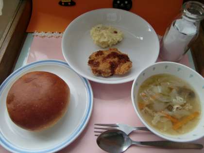 今日は区連体応援メニューです。弱気なこと、臆病になることを「チキン」と言うのでそんな心に勝ってほしい!という意味を込めて『チキンカツ』です。しっかり食べて練習を頑張りましょう。