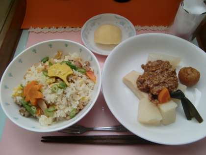 朝晩は寒さが増してきました。もう少しすると落ち葉の季節を迎えます。今日は、ひと足早く 風 で吹き寄せられた秋の落ち葉や 葉 をイメージしたご飯です。彩りも楽しみながら食べてください。