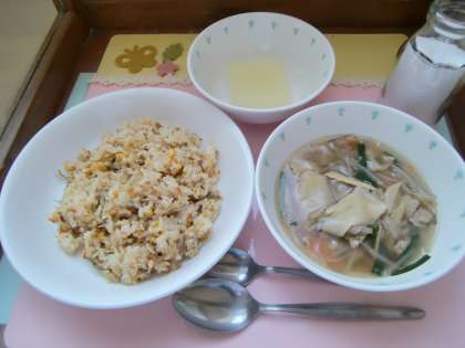 東山中学校のチャーハンは、きちんと炒めて作っています。チャーハンだから当たり前と思うかもしれませんが、600人分を作るには大きな釜でも一度ではできません。120人分ずつを一気に強火で炒めてパラパラに仕上げます。けっこう難しく、技のいる調理です。