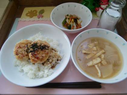 つくねは、こねて丸める意味の動詞つくねるに由来される料理です。タレを絡めてどんぶりにしました。ご飯と一緒にいただきましょう。