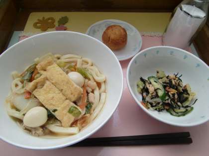 今日は、大きめに切った油揚げを入れたきつねうどんです。関東では油揚げののったうどんをキツネ、天かすがのるとタヌキと呼びます。しかし関西では、そばの上に油揚げがのったものをタヌキと呼ぶそうです。地域が変われば表現も変わる…おもしろいですね。