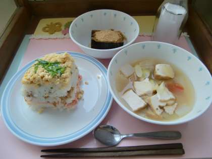 給食室で切れ目を入れて出しますが、切れ目を入れる作業も慎重に慎重に…。教室での配膳も崩さないようにするのが難しかったようですが、最後の方はすっかり慣れてとても上手に盛りつけていました。