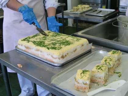 酢飯と具を重ね合わせた押し寿司は、関西で見られる事が多い料理です。鮭を焼き、ほぐして小骨を取るなどのていねいな作業を経て6層になったお寿司は彩りも良く、見ても楽しめる料理です。