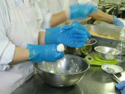 ミルクくずもちは人気のデザートです。葛粉とでん粉を牛乳と合わせて練り、ひとつひとつ丸くとってきなこをまぶしました。とてもきれいに作りだす調理員さんの手さばきが素晴らしかったです。