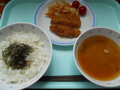 6月22日木曜日 公開日 2017/06/22 更新日 2017/06/22 給食 ご飯 青のりふりかけ アジフライ 茹でキャベツ ミニトマト 味噌汁 牛乳 産地情報 キャベツ(千葉)人参(千葉)トマト(愛知)じゃがいも(長崎)長ネギ(千葉)アジ(タイ)わかめ(徳島) いいね(0)